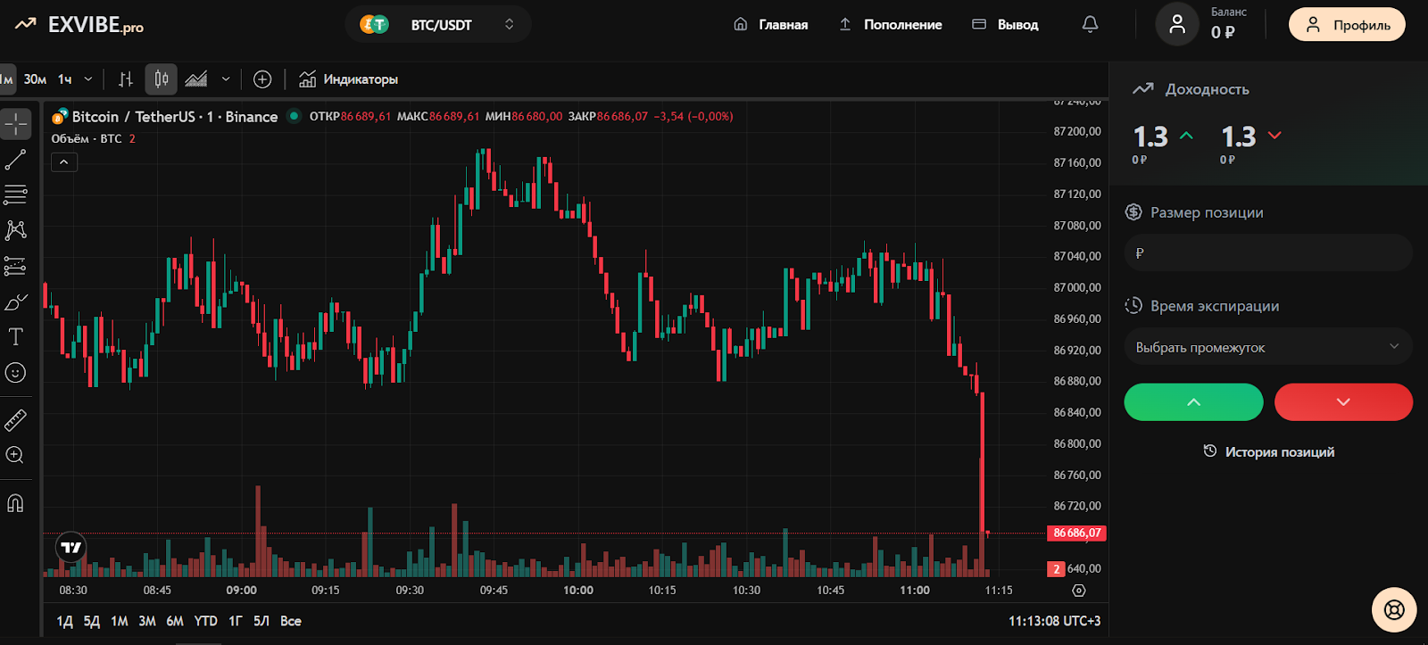 На платформе не прописаны торговые условия, потому что трейдинга как такового и нет. Согласно правилам, это игра, имитирующая сделки. Поэтому отсутствие регламента вывода средств вполне логично. Пользователям будет доступен примитивный терминал, где можно открывать ставки на повышение и понижение стоимости активов — бинарные опционы. Количество криптовалют небольшое, менее 20, стоимость монет отличается от реальных котировок, так как все цены имитируются.