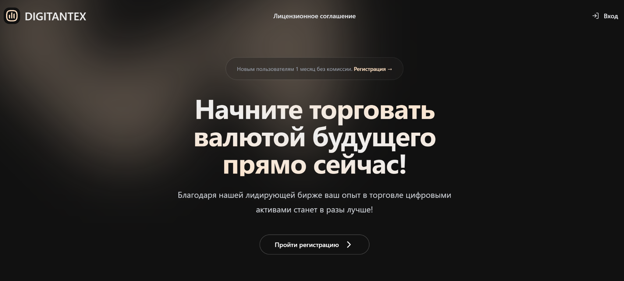 Интернет адрес Digitantex World зарегистрирован 18 января 2026 года, сайт практически никто не посещает, что говорит о многом. Например, это означает отсутствие регулярных трейдеров, ликвидности, а, следовательно, торговля имитируется. В первый месяц пользователям обещаны сделки без удержания комиссионных. Платформа доступна на нескольких языках, основной — русский. Никаких контактных данных организация не предоставляет, нет даже онлайн чата. Социальных сетей проект не ведет, на мониторинговых площадках не фигурирует, что тоже является тревожным звонком. Юридически конторы просто нет, стоит ли говорить о какой-то финансовой безопасности для клиентов? Главная страница платформы выглядит так.