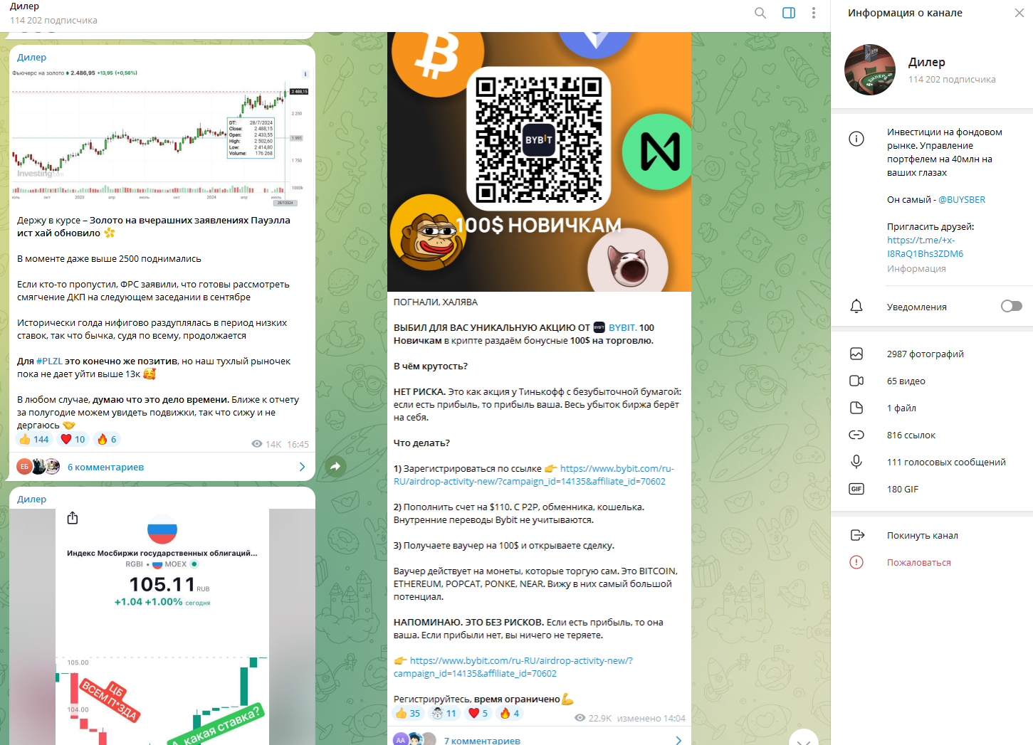 Телеграм-канал об инвестициях на фондовом рынке “Дилер” работает чуть больше двух лет, а его админом является человек с ником Дилер ADM (@ buysber). Площадка имеет 115 тысяч подписчиков, но известной ее назвать трудно. Все потому, что активность в блоге не соответствует количеству участников и на просторах интернета нет о нем упоминания. Несмотря на это, админ ежедневно публикует различные посты. В основном, его контент состоит из обзоров на крипторынок, рекомендации сторонних сервисов и личного мнения по поводу ситуации в мире инвестиций и трейдинга.