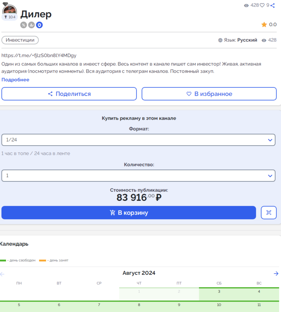 Определенных платных услуг от админа отыскать не получилось. Предположительно, что свою прибыль трейдер получает с рекламных интеграции различных игр, бирж и других смежных сервисов. Это подтверждает и найденная в открытом доступе информацию о покупке рекламы на данном канале. Так, стоимость одного дня составляет почти 84 тысячи рублей.