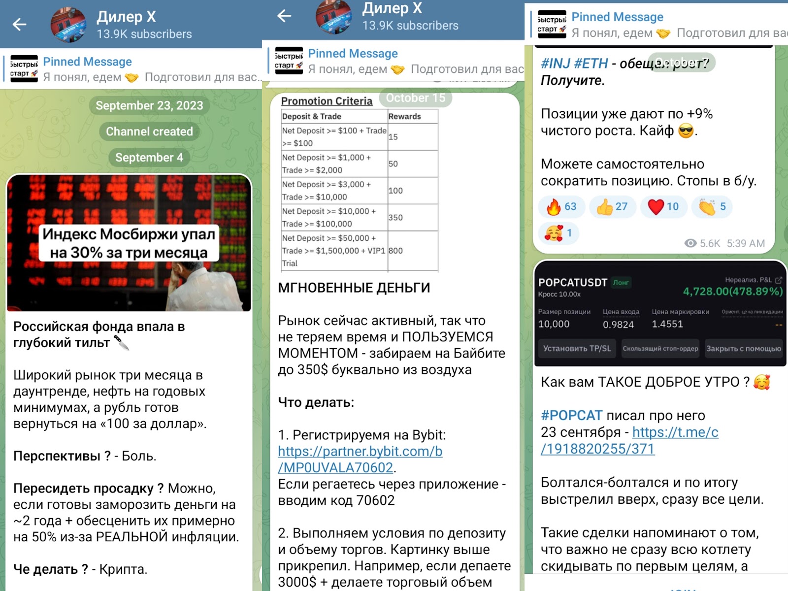 К негативному моменту можно отнести регулярное продвижение биржи ByBit. Основатель предлагает проходить регистрацию по собственному промокоду. В таких публикациях админ сообщает, что партнеры получат дополнительные бонусы. На самом деле трейдер сам получает прибыль с приведенных пользователей.