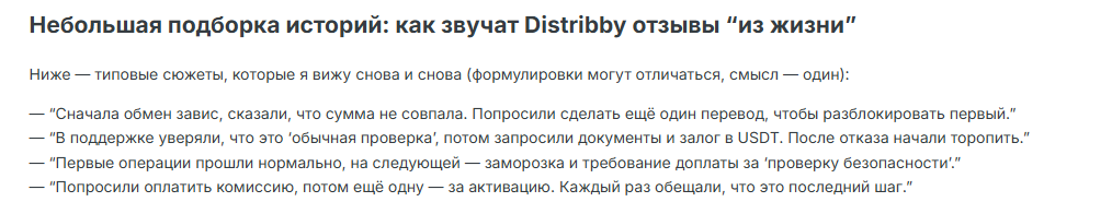 В сети реальных упоминаний о проекте значительно меньше, чем заявлено на сайте. На профильных форумах встречаются отзывы о зависших переводах и требованиях администрации Distribby com оплатить дополнительные сборы. Чаще всего люди жалуются, что поддержка ссылается на несоответствие суммы и риска отмывания средств, а после нескольких сообщений перестает выходить на связь.