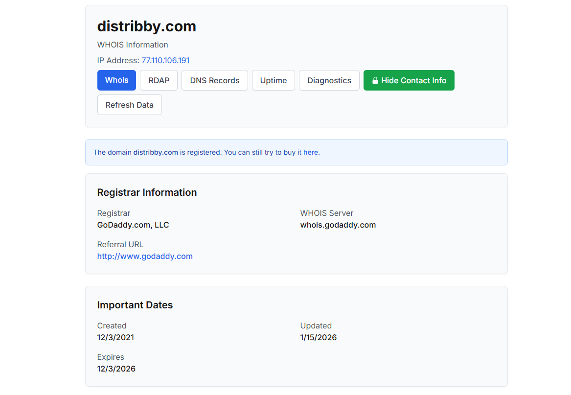 По информации, указанной в Whois, домен «Дистрибби ком» был зарегистрирован в конце 2021 года через регистратор GoDaddy, хотя на сайте заявлено 8 лет активной деятельности. Также обменник Distribby com указывает свыше 24 000 активных клиентов, более 61 000 заявок и около 900 отзывов, однако независимых подтверждений этим цифрам не найдено.