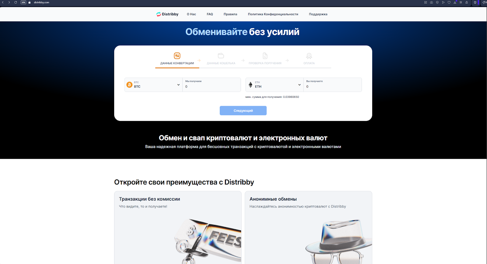 Сайт «Дистрибби ком» сделан в минималистичном стиле. На главном экране Distribby размещен калькулятор курсов, чуть ниже список объявленных преимуществ. Для совершения обмена нужно выбрать пару, указать сумму и получить итог к зачислению. Для операций доступны 24 монеты. Заметим, что в соглашении указана комиссия в 1%, хотя на главной странице написано, что обмены совершаются без каких-либо доплат.