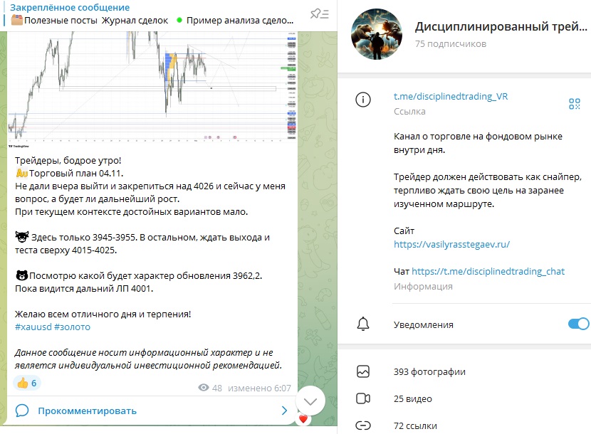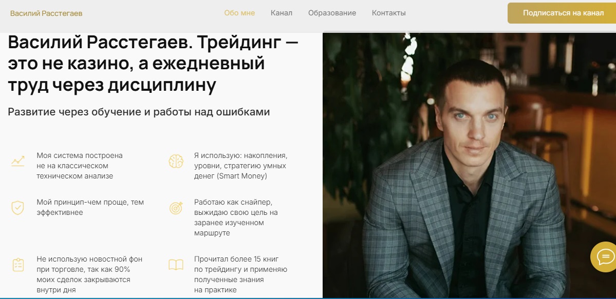 Но 2024 год был не самым лучшим для Этажей, выручка резко снизилась на 36%, а по годовым показателям компания зафиксировала убыток 9,6 млн. руб., рентабельность минус 17%. Штат пришлось сократить почти половину. Вполне возможно, что такая нестабильная ситуация с недвижимостью подтолкнула Василия искать другие источника дохода и он обратился к трейдингу.Публично Расстегаев позиционирует себя как частного трейдера и автора проекта “Дисциплинированный трейдинг”. Он утверждает, что торговля для него “не казино, а ежедневный труд через дисциплину”. В канале и на сайте он описывает собственную торговую систему, основанную не на классическом техническом анализе, а на “стратегии умных денег (Smart Money)”, а также работе с накоплениями, уровнями и имбалансами.