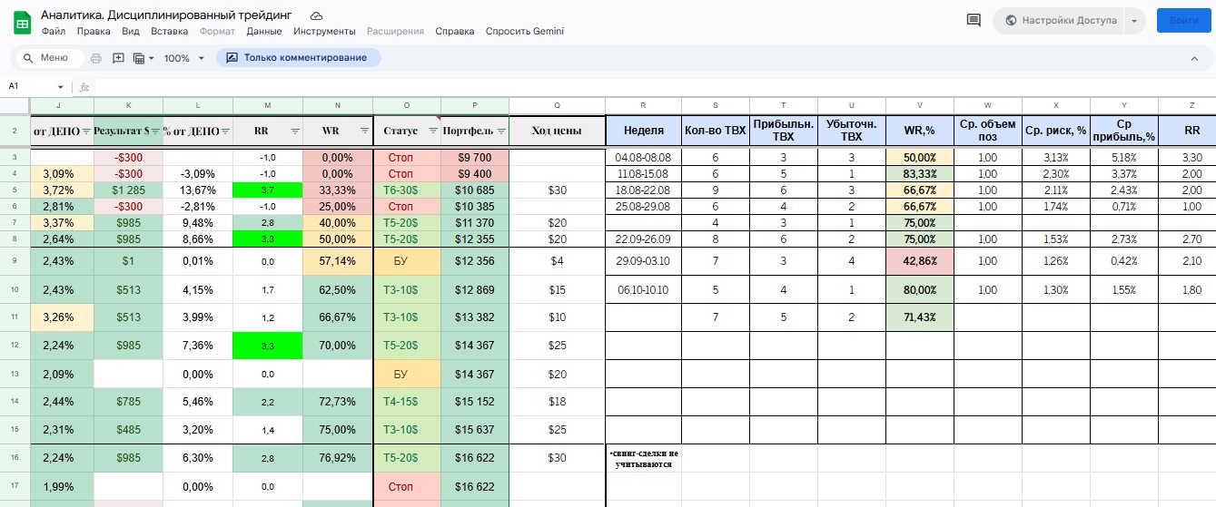Автор пишет, что действует “как снайпер”, выжидая сигналы на заранее изученных уровнях, не использует новостной фон, потому что 90% сделок закрываются внутри дня. Торгует только драгметаллами (золото, серебро) и нефтью. Основное обучение, кроме курсов, прочитал более 15 книг по трейдингу. Для фиксации сделок создана открытая Google-таблица с разборами сетапов и пояснениями по точкам входа/выхода.
