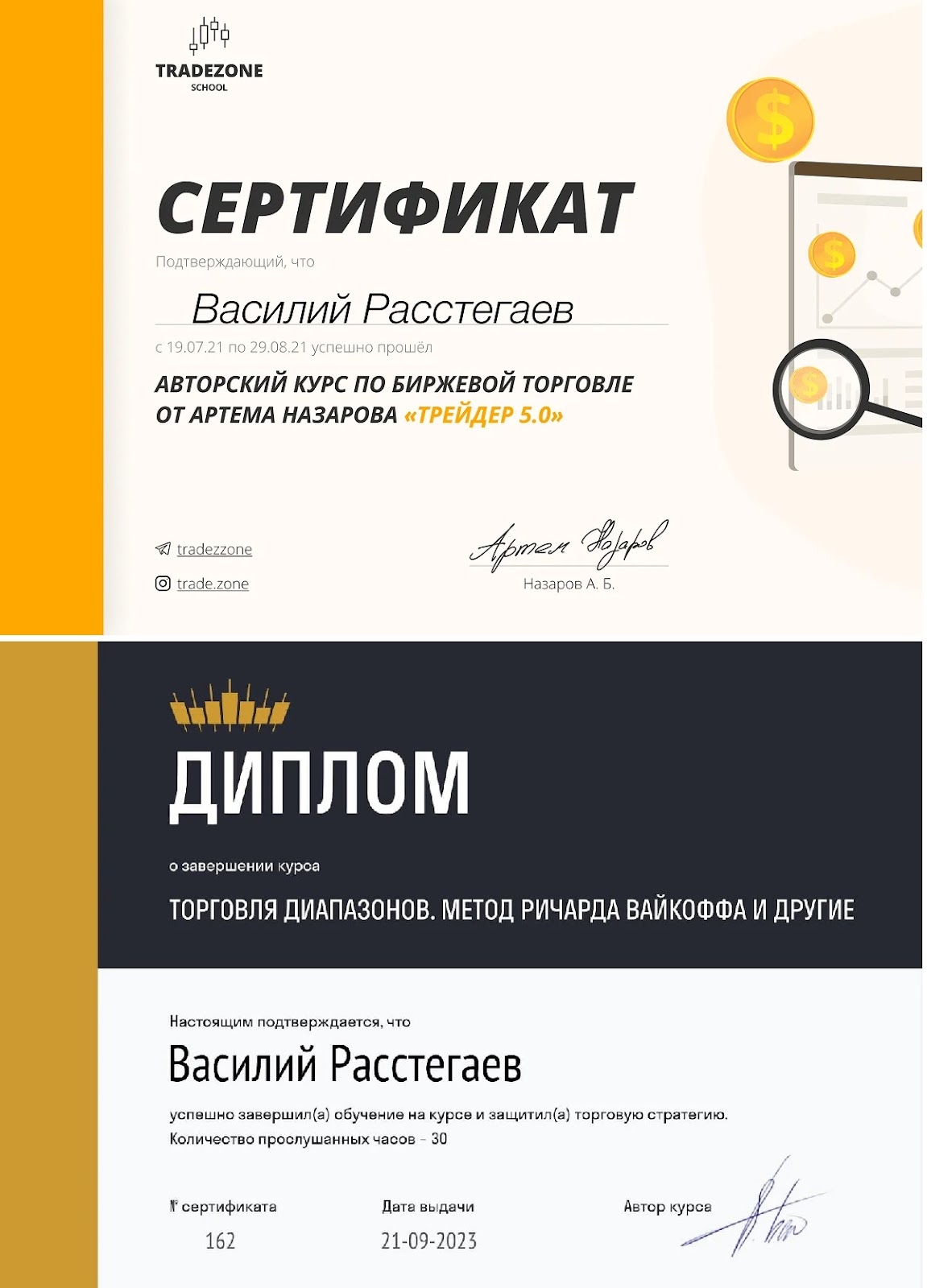 В 2021 году прошел Авторский курс по биржевой торговле от Артема Назарова «Трейдер 5.0». В сентябре 2023 получил диплом о прохождении курса «Торговля диапазонов. Метод Ричарда Вайкоффа» все в той же Школе TradeZone Артема Назарова. В июле 2025 года запустил трейдерский проект, где планирует открыто показывать свою работу и в дальнейшем создать курс по Смарт Мани.
