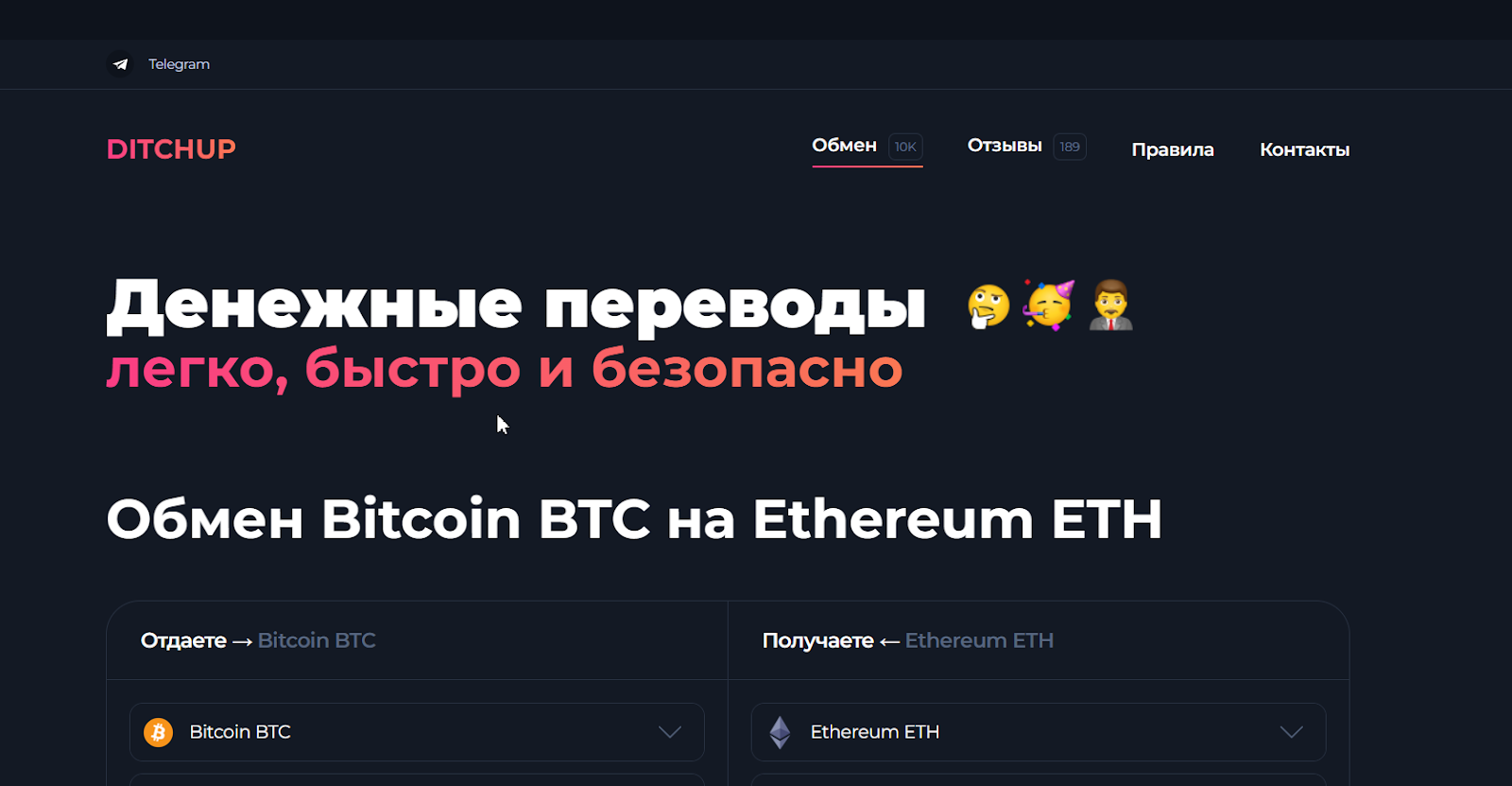 Обменник Ditchup предлагает легкие, быстрые и безопасные денежные переводы. Регистрация личного кабинета для этого не потребуется. Создатели заявляют, что используют AML-проверку средств. Администрация предупреждает, что не сотрудничает с финансовыми биржами Garantex, CommEx. Клиент потеряет деньги, если укажет эти реквизиты – причем без возможности возврата денег.