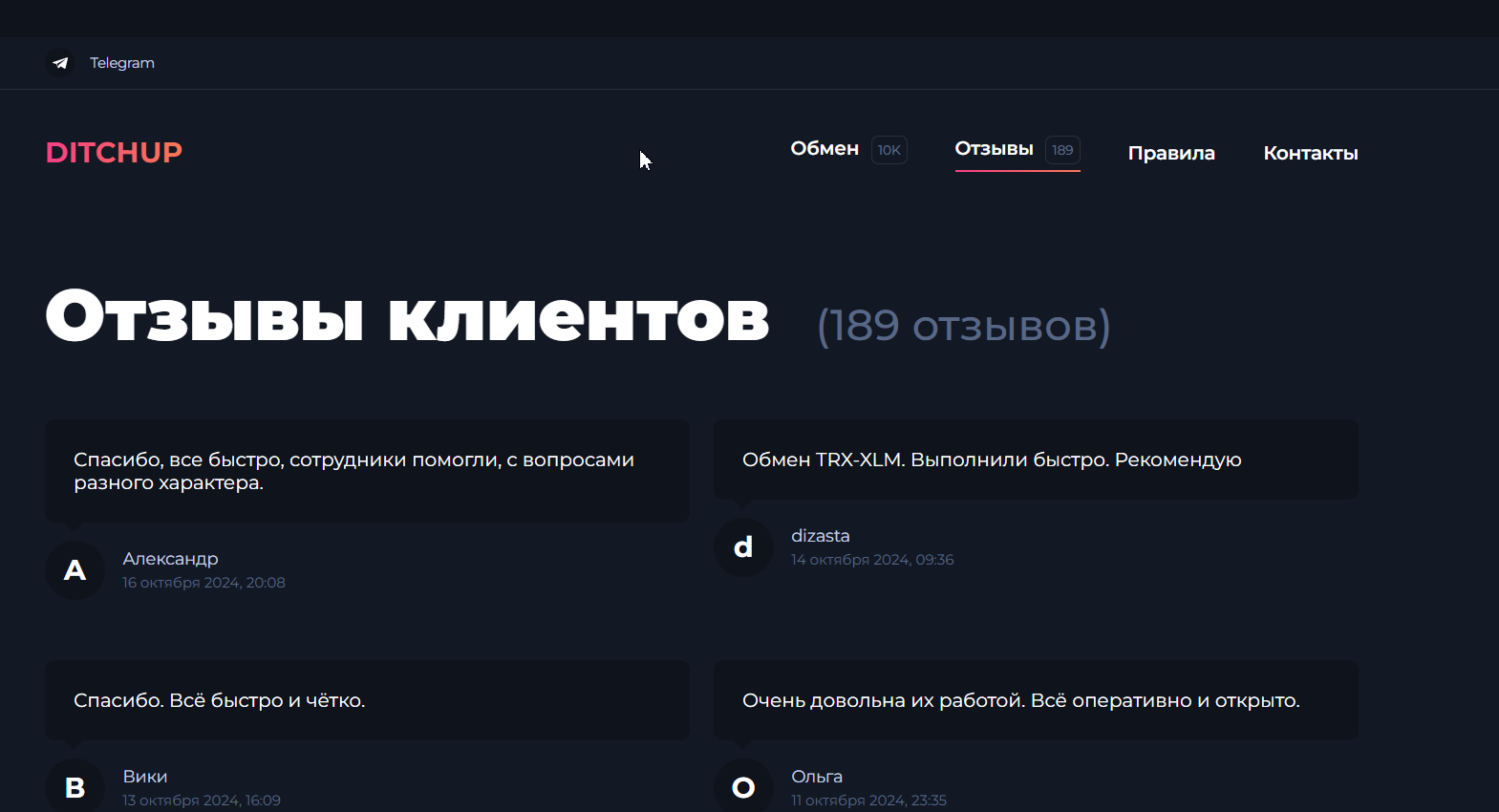 Отзывы о качестве обслуживания можно найти на самом сайте. Все они положительные. Во вкладке указано, что всего их 189. Однако, на странице отображается только часть из них – остальные данные при конкретном запросе не подгружаются. Самый ранний из доступных к ознакомлению оставлен в феврале 2024 года. С тех пор новые отзывы о Ditchup support стабильно публиковались каждые несколько дней. Последний оставлен в середине октября. Администрация призывает пополнить коллекцию откликов – но после совершения обмена. Формы для заполнения до момента регистрации платежа в интерфейсе нет.