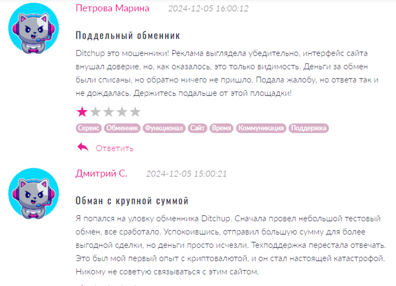 Попытки связаться с операторами службы поддержки Ditchup остаются бессмысленными. На связь администрация не выходит. Согласно реальному пользовательскому опыту, беспроблемно проходит только тестовый обмен на небольшую сумму. Таким образом, репутация инструмента, отображенная на официальном сайте обменника во всем противоречит мнениям трейдеров на других ресурсах.