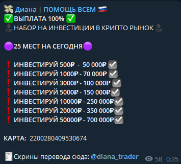 - подобные каналы всегда похожи: отзывы, нереальные заработки и прямые переводы на карту.