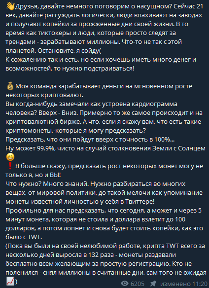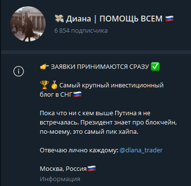 Dlana Trader — мошенница из Telegram, которая предлагает раскручивать счет клиентов. Автор говорит, что у нее есть своя команда, которая умеет прогнозировать крипту. Нужно разбираться, в чем именно Dlana пытается обмануть своих подписчиков.