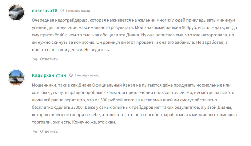 Естественно, Диана — мошенница. Она просто собирает деньги с доверчивых клиентов. Причем после первого перевода она заявляет, что вот, прибыль на руках, но нужно оплатить комиссию. И после второго перевода следует блокировка.