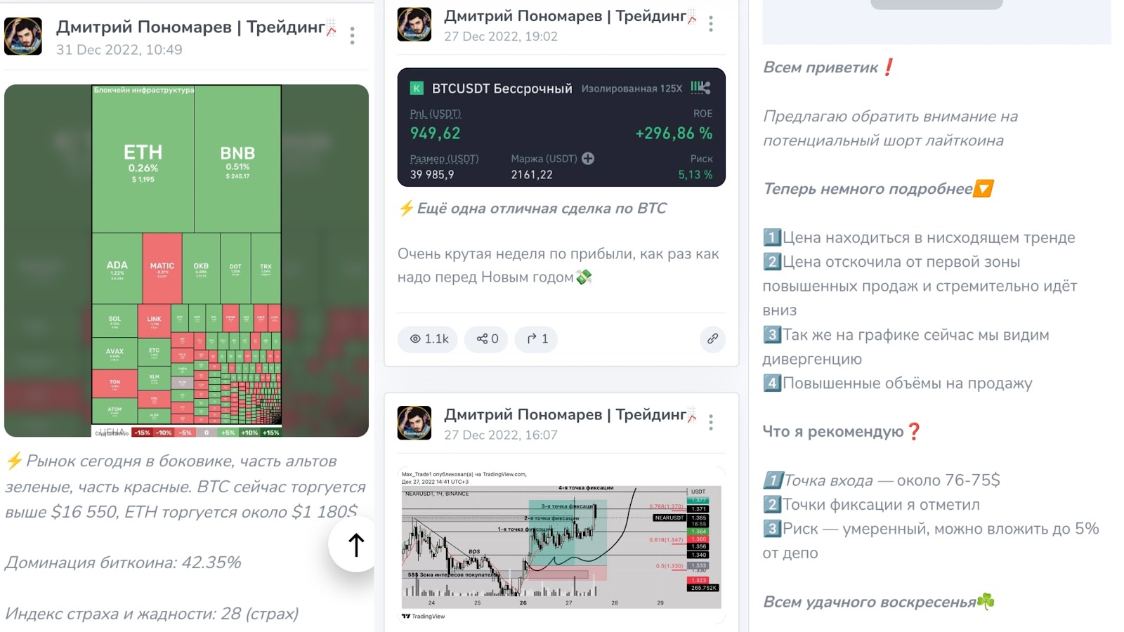В ленте сообщества выкладываются краткие разборы криптовалют. Админ сообщает, какие из них лучше приобретать. Подписчики также могут ознакомиться с общедоступными торговыми сигналами. Трейдер выставляет результаты сделок. Однако, как даже упоминают в отзывах, Дмитрий Пономарев не ведет подтвержденных отчетов по торговле. В Телеграмме можно изучить ситуацию рынка. В таких постах автор рассказывает о капитализации рынка, доминации монет. Также в паблике размещены базовые понятия для трейдеров.Исходя из отзывов пользователей, в личных сообщениях можно узнать о том, что парень продвигает ВИП канал. В нем обещает демонстрировать качественные сделки. Цена доступа — 100 долларов в месяц.