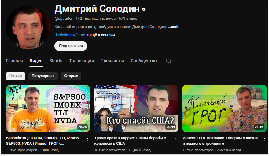 Ютуб-канал Дмитрия uptrader в последний год отошел от инвестиционной тематики, макроэкономические новости всплывают, но большее внимание Солодин уделяет своей жизни. Кроме того, рассказывает о технологиях, банкинге и политике.