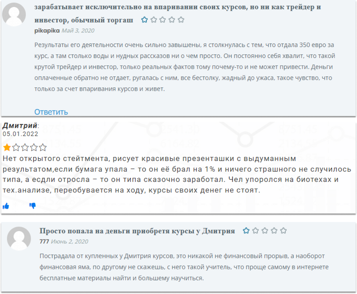 Их в сети масса, приводить все не имеет смысла. Думаем общий настрой к негативу вы уловили. Большая часть отзывов говорит о бесполезности материала и той воде, что заполонила умы клиентов. Дмитрий Солодин – профессиональный инвестор, но отвратительный преподаватель, так говорят даже те, кому лекции достались через инсайдерский слив, т.е. бесплатно.