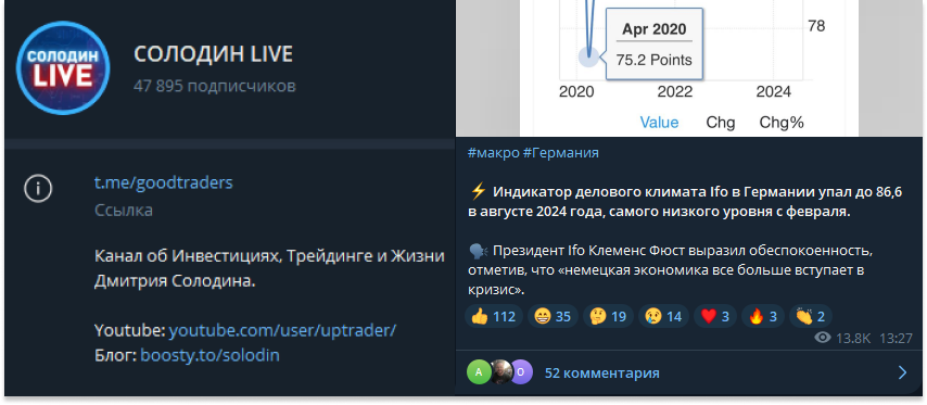 Для личной жизни и лайв-контента есть инстаграм dsolodin. В рамках обзора его мы затрагивать не будет, тем более посты выходят редко и с трейдингом не связаны. Контингент соответствующий, тематика путешествий и кулинарии им гораздо ближе, чем ММВБ.