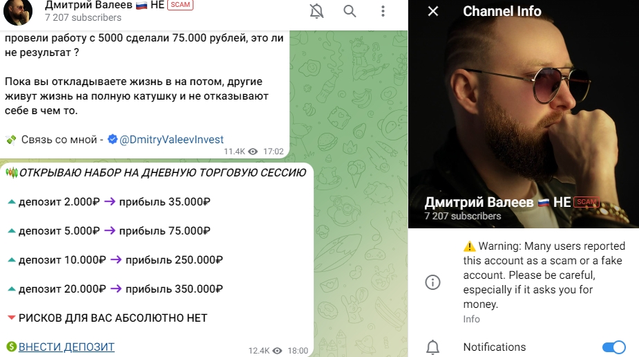 Кстати, канал инвестора Телеграм заклеймил как скам, при этом тем более важно провести обзор, ведь в случае, если трейдер оказывается жуликом, скоро он начнёт окручивать новую аудиторию на другом канале. Замечайте схожие схемы обмана и не ведитесь. Также есть подозрения, что некий Дмитрий уже удалял всю информацию с канала, чтобы исчезнуть на некоторое время и вновь объявиться с отработанными приёмами обмана.