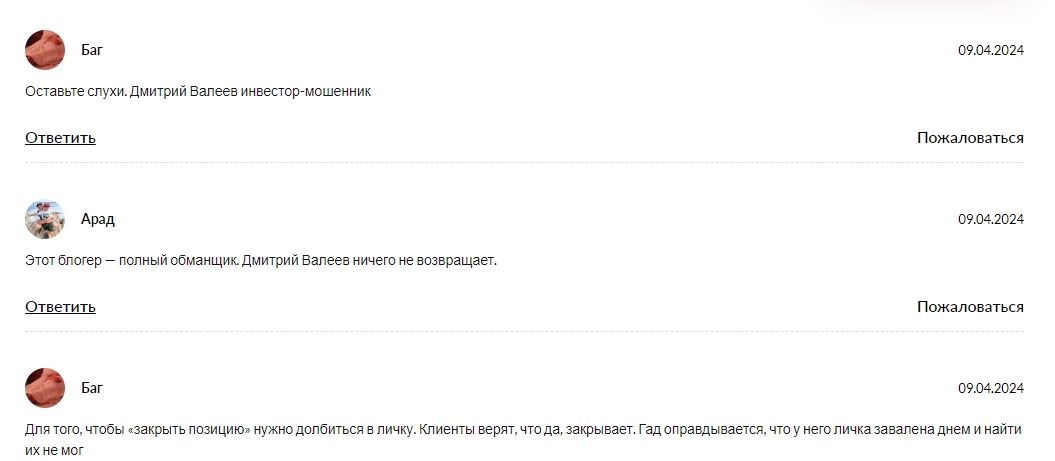 На канале трейдера более 7 тыс. подписчиков. Аккаунт владельца канала – Dmitryvaleevinvest. В постах он активно призывает присоединиться к торговым сессиям, то и дело выкладывая сканы отчётов от подписчиков, и переписки. Из-за того, что данные действия совершают и аферисты, мы учитываем только мнения участников проекта на сторонних ресурсах.