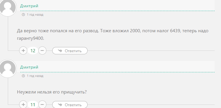 Отзывы обманутых инвесторов щедры на признания – к сожалению есть много обманутых юзеров, которые делятся, что после вклада в сумме 2 тыс., Валиев просит отослать на налог 6 тыс., а затем ещё более 9 тыс. гаранту.