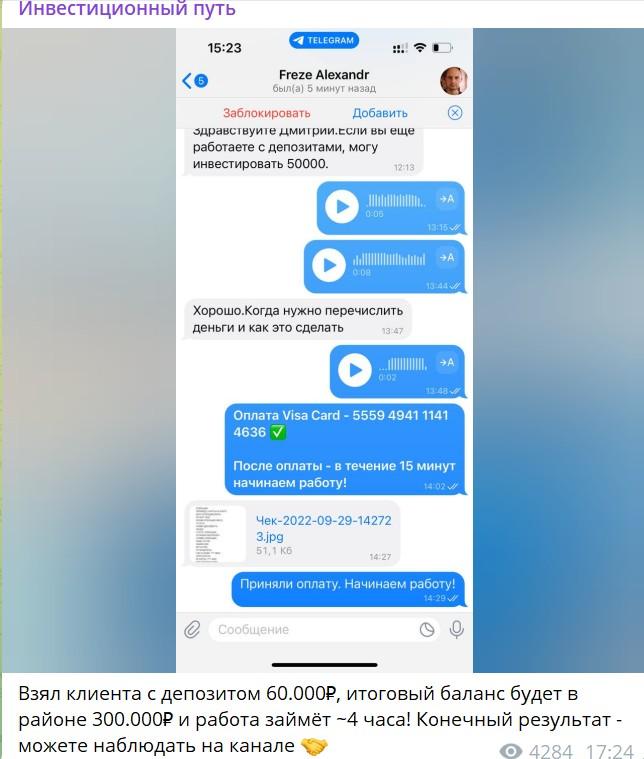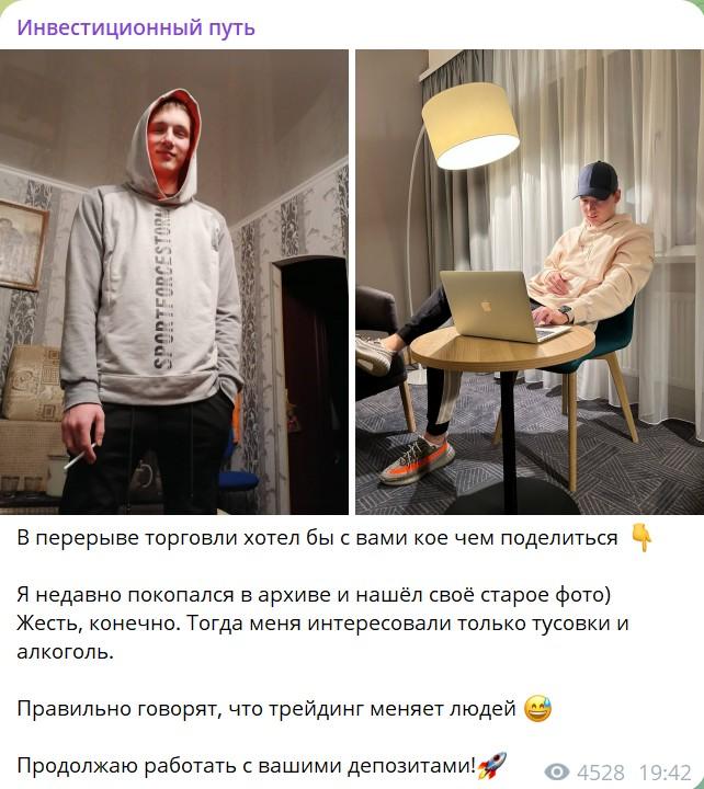 DmitriyTheCrypto – ник в Телеграме некоего Дмитрия, который называет себя успешным трейдером. Он создал канал в мессенджере «Инвестиционный путь», где делится советами и принимает депозиты, обещая высокий доход. На данный момент на группу подписано 5 252 человека. Посты набирают много просмотров, но комментарии оставлять нельзя и реакции ставить тоже. Поэтому невозможно оценить, довольна ли аудитория контентом и сотрудничеством с трейдером.