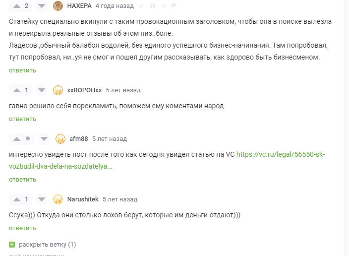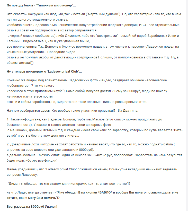 Отзывы о Ladesov в сети негативные, хотя на ресурсах наставника льется один позитив. Что известно о Дмитрии: в 2019 году на него было заведено дело об отмывании денег. Ладесов легко отделался штрафом. Однако в сети часто мелькают комментарии, что Дмитрий Ладесов — Телеграм мошенник. Его обвиняют в том, что в клубе он скидывает кейсы тех учеников, у которых хоть что-то получилось. А остальным говорит “кнопки бабло я вам не обещал”. Помощи подписчики не получают, обучения как такового нет. Что касается его инвестиционных рекомендаций, то и здесь на независимых ресурсах много отрицательных отзывов о Ladesov crypto priority. Подписчики подолгу сидят в сильной просадке, а когда им удается зафиксировать 3-4% прибыли, Дмитрий заявляет, что он гений.
