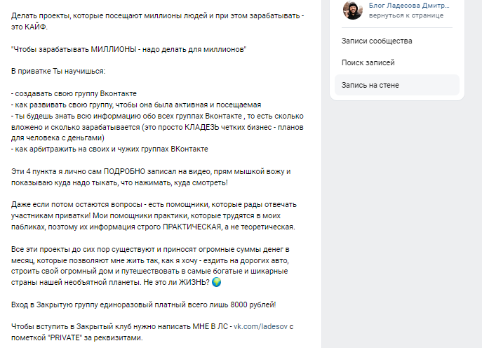 • закрытый клуб — цена 8000 рублей, пошаговая инструкция, как создать, раскрутить сообщество в ВК и зарабатывать на этом;