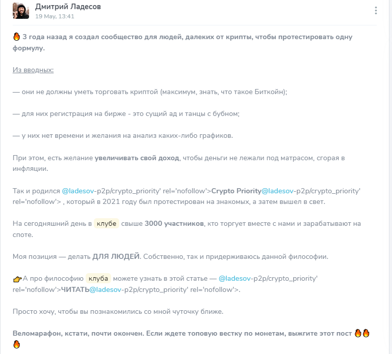Еще один Телеграм канал Дмитрия Ладесова насчитывает почти 150 тысяч подписчиков. Посты читает чуть больше 10%, комментарии скрыты, вовлеченность крайне низкая. В Ladesov telegram есть розыгрыши небольших денежных сумм для реферальных подписчиков автора на криптовалютной бирже. Также ladesov77 показывает свои доходы от инвестиций в крипте и на фондовом рынке. Полезного контента нет, никаких торговых идей, обучающих статей в ленте. Активно ведется реклама Ladesov crypto priority — закрытый клуб для подписчиков с сигналами для спотовой торговли криптой и рекомендациями на российском фондовом рынке. Стоимость не озвучивается, для доступа нужно обращаться к администратору проекта cryptoladesov.
