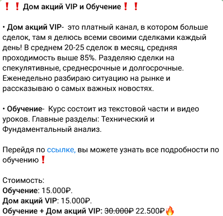 В июле 2023 года большинство сигналов стали публиковаться в закрытом канале «Дом акций VIP». Вход в него обойдется в 15 тысяч рублей.За эти деньги пользователям обещают: