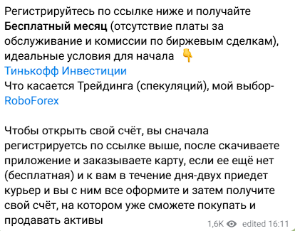 Канал «Дом акций 2.0» существует с июля 2021 года. Буквально с первого поста трейдер принялся рекламировать сторонние проекты. Среди них были «Тинькофф Инвестиции» и RoboForex. Сразу была опубликована и подробная методичка для начинающих трейдеров и инвесторов.