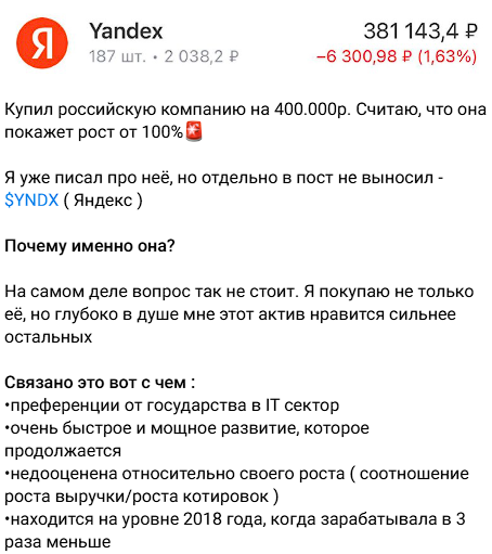 Отметим, что каждый сигнал содержит развернутое описание. Аналитик anton7invest подробно аргументирует свой выбор, объясняя, почему сделан тот или иной выбор. Статистика самих сделок не отслеживается. Периодически публикуются скриншоты инвестиционного портфеля инвестора с указанием заработка или потерь.