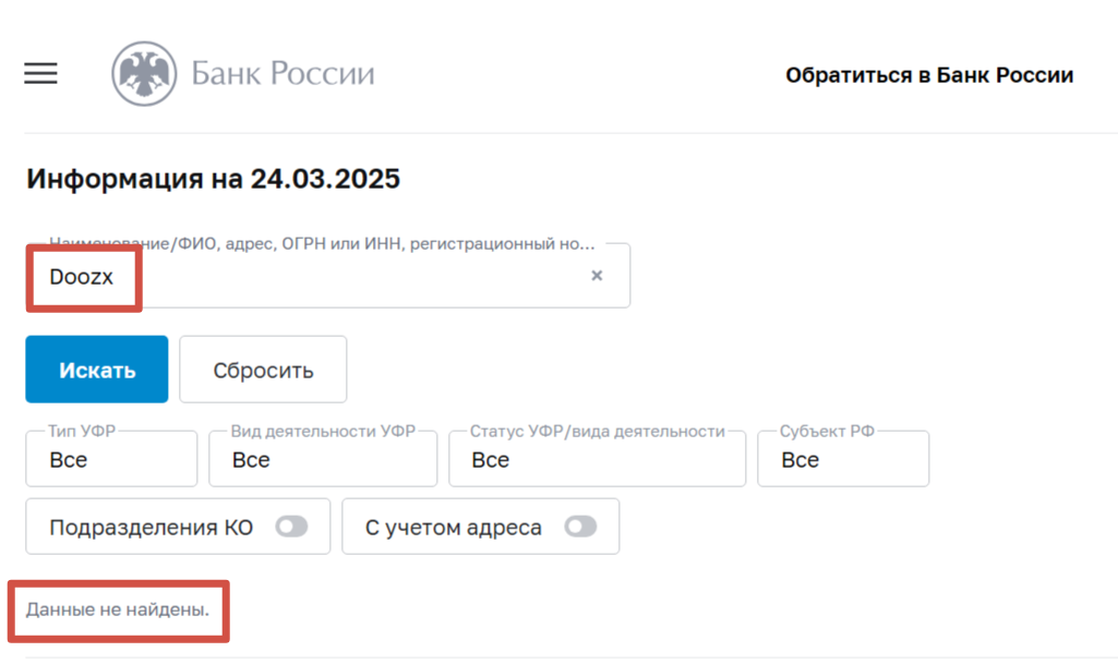 На странице нет сведений о владельцах платформы, ссылок на регистрационные документы и лицензию. Также компания не внесена в списки Центробанка РФ. Это означает, что любые услуги предоставляемые Doozx Com в России незаконны.