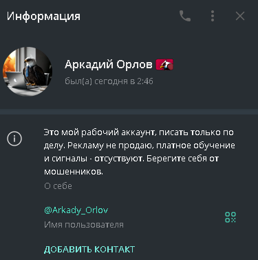 Аркадий Орлов ведет канал как личный дневник, не ставя перед собой цели создать какое-либо впечатление у пользователей или предложить им свои услуги. Информация может быть интересна другим трейдерам – так как похожа не действительную, а методы работы автора приносят небольшую прибыль.