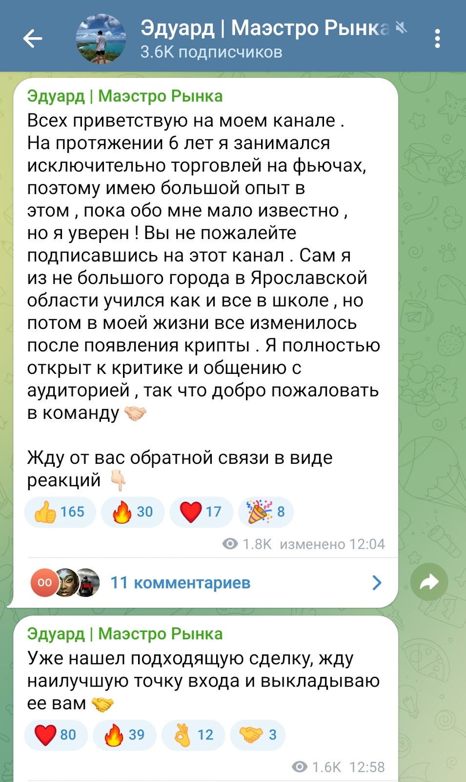 Практически вся лента канала Эдуард Маэстро Рынка состоит из торговых сигналов. Иногда публикуются новости и обзоры монет. Если верить автору, то практически все сделки закрываются с прибылью. Реального подтверждения этого нет. Общая статистика торговли не ведется. Как блогер анализирует рынок и делает свои прогнозы непонятно. Скорее всего, он перепечатывает их с других каналов.
