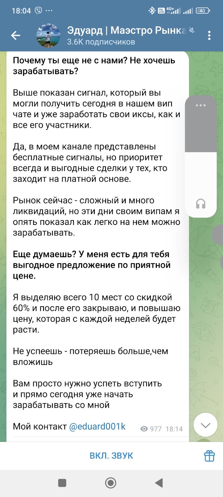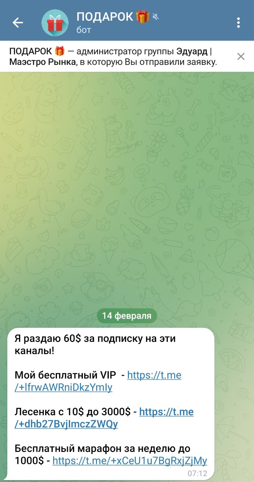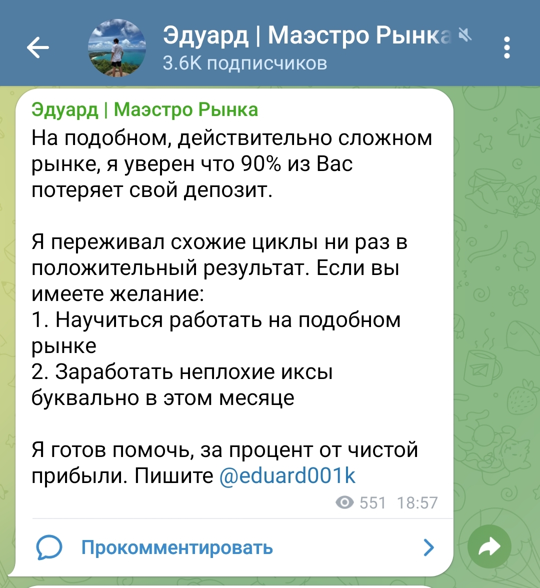 Кроме платного канала трейдер предлагает индивидуальное наставничество за процент от чистой прибыли.При подписке на Эдуард Маэстро Рынка, Eduard001k обещает подарок 60$ за подписку на телеграмм каналы сторонних трейдеров. Как забрать приз автор не сообщает.