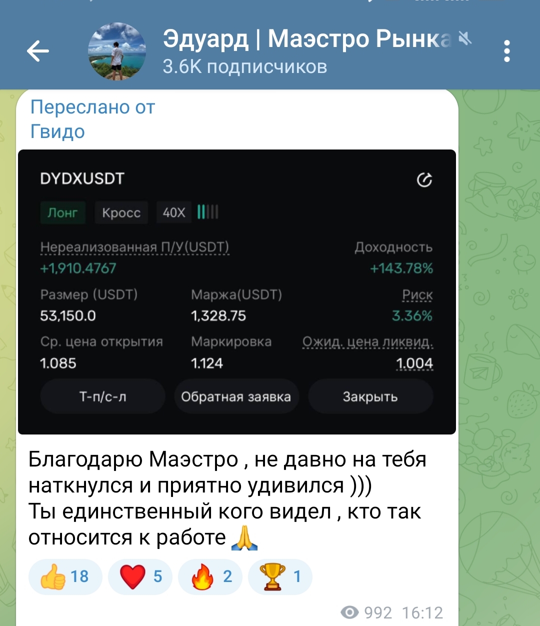 Телеграмм проект трейдера Эдуард Маэстро Рынка, отзывы клиентов о сотрудничестве с Eduard001k