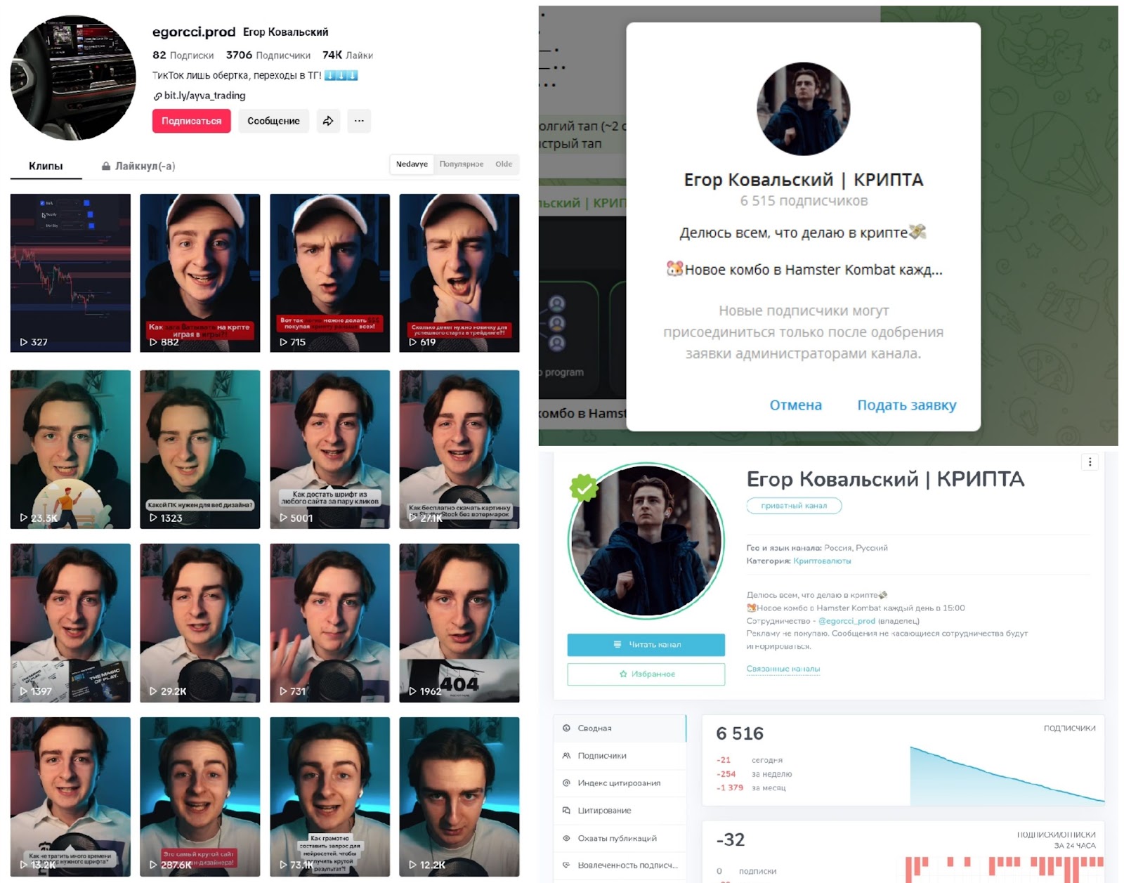 Свою деятельность Егор, судя по анализу соцсетей, начал в тиктоке и позиционировал себя как эксперта в дизайне. Его ролики изредка залетали и набирали хорошие просмотры, но число подписчиков не увеличивалось, поэтому канал насчитывает всего 3000 людей. С недавнего времени он начал публиковать видео на тему инвестиций и трейдинга, но видимо, аудитории это не зашло. Оказалось, у Егора Ковальского есть отдельный канал, посвященный крипте, который имеет 6,5 тысячи подписчиков. Но попасть на него можно только после того, как админ примет заявку, так как канал являлся закрытым. С чем связано такое решение, неизвестно. И к сожалению, нашу заявку не приняли, поэтому подробно разобрать его деятельность не получится.Зато, нам удалось найти статистику его блога Egorcci Prod в открытом доступе. Оказалось, что его проекту всего 2 месяца, а аудитория была искусственно накручена. Теперь же пользователи стали активно отписываться. Плюс, на статистике видно, что настоящая вовлеченность от участников канала составляет всего 1%.