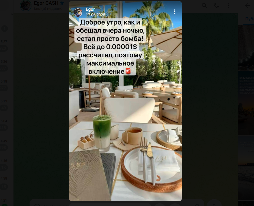 Публикации оформлены в стиле мотивационных военных сводок: “я в позиции”, “вижу слабость”, “работаю по плану”, “готов к охоте”. Несмотря на обилие сообщений о том, что “сделка пошла”, прозрачной статистики нет.