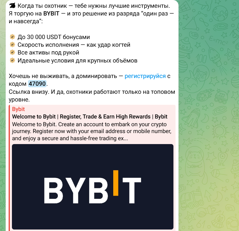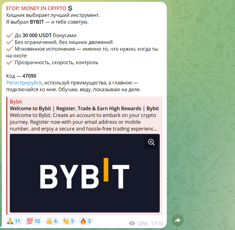 Вся схема заработка построена просто: автор создает образ хладнокровного охотника, который якобы чует рынок и всегда заходит на пике. Почти каждый пост заканчивается одной и той же фразой “пиши в личку”. Именно там клиентам дают реферальный код и попросят зарегистрироваться на бирже BYBIT. Это и есть главный источник дохода.