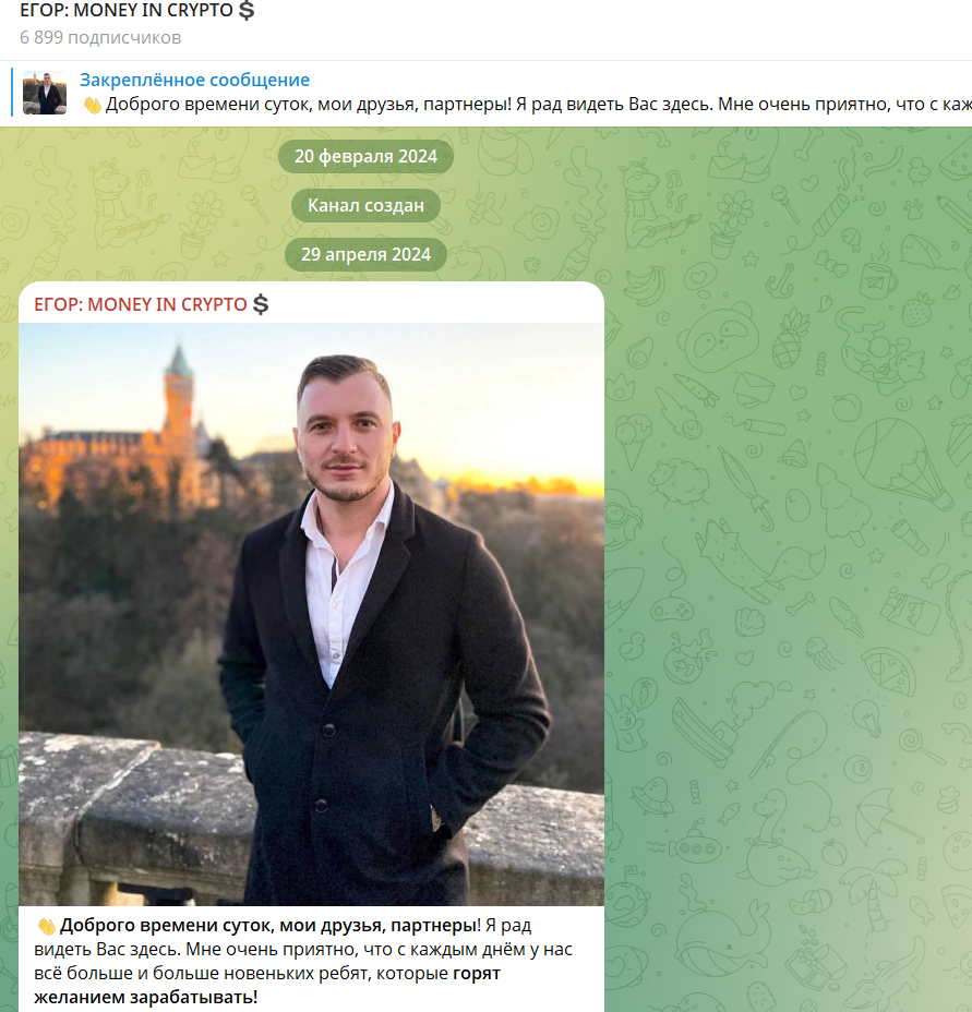 В ТГ существует канал с названием Егор Money In Crypto, вокруг которого витает ореол успеха и загадочности (правда отзывов практически нет). Канал был создан 20 февраля 2024 г., но выглядит как закрытый клуб с почти 7 тысячами подписчиков. Попасть туда можно только после одобрения админа — вход по заявке.
