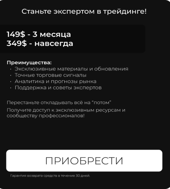 Подписчикам, которые хотят получить более «углубленные» знания о трейдинге и рынке в целом, трейдер предлагает платную подписку на свой вип-канал Whale Crypto0. По заявлениям автора EgorVolkov, в нем он делится своим опытом, конкретнее раскрывает различные ситуации на рынке и держит связь со своими подписчиками, помогая им в различных вопросах. Подписаться можно навсегда за 349 долларов или на 3 месяца за 149 долларов.