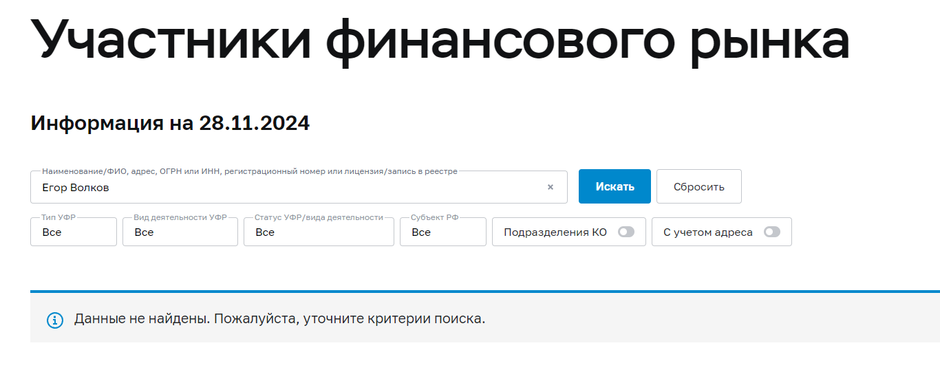 Трейдер представляет себя как профессионального и успешного человека, который хочет помочь своим подписчикам. Для этого он демонстрирует по-настоящему рабочие методы как можно разобраться или улучшить свои знания о трейдерской сфере. «Егор Волков крипта» обещает своим клиентам положительный и новый опыт, а также способы заработать, плюс довольно много новых знаний о трейдинге. Для начала, мы решили провести анализ его деятельности и наткнулись на отсутствие у трейдера EgorVolkov официальных лицензий от ЦБ РФ.