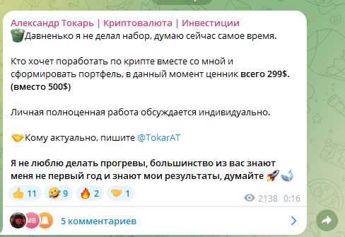 На одном из Тг-каналов Токаря есть предложения о совместной работе с экспертом. Стоимость составляет 299 долларов по скидке. Но судить о качестве такой совместной работы трудно, ведь трейдер ничем не подкрепляет свои слова об успешных сделках.