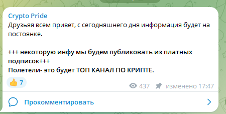 Несмотря на то, что Александр обещал публиковать на обозреваемом канале новости на постоянной основе, практически сразу после этих слов публикации прекратились. Канал Crypto Pride не обновлялся с 2022 года.