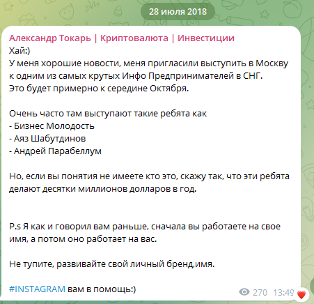 Один из старых каналов Александра был создан в 2018 году. Но там нам не удалось найти хоть какую-нибудь информацию о крипте, хотя бы упоминание вскользь, хотя Токарь и утверждает, что работает с ней с 2016 года. Зато есть много публикаций о сетевом бизнесе (МЛМ), личностном росте.