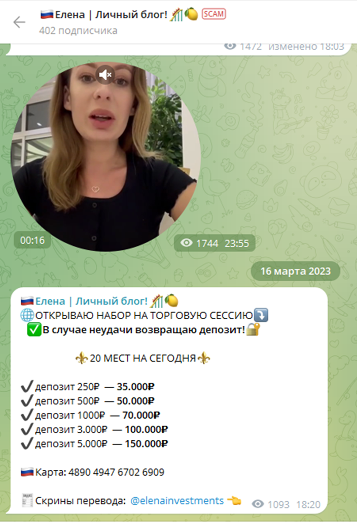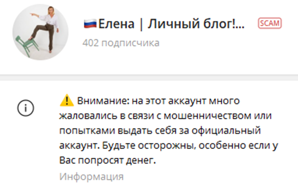 Еще одно доказательство, что перед нами развод — присвоение каналу “Елена Личный блог” отметки скам. В описании канала сказано, что проект мошеннический и получил отметку в связи с жалобами пользователей. Последний пост в чате датирован мартом 2023 года, остальные аккаунты женщины удалены. Поэтому не исключено, что на просторах телеграмм вскоре появятся каналы с другими названиями, но этой же женщиной на заставке.