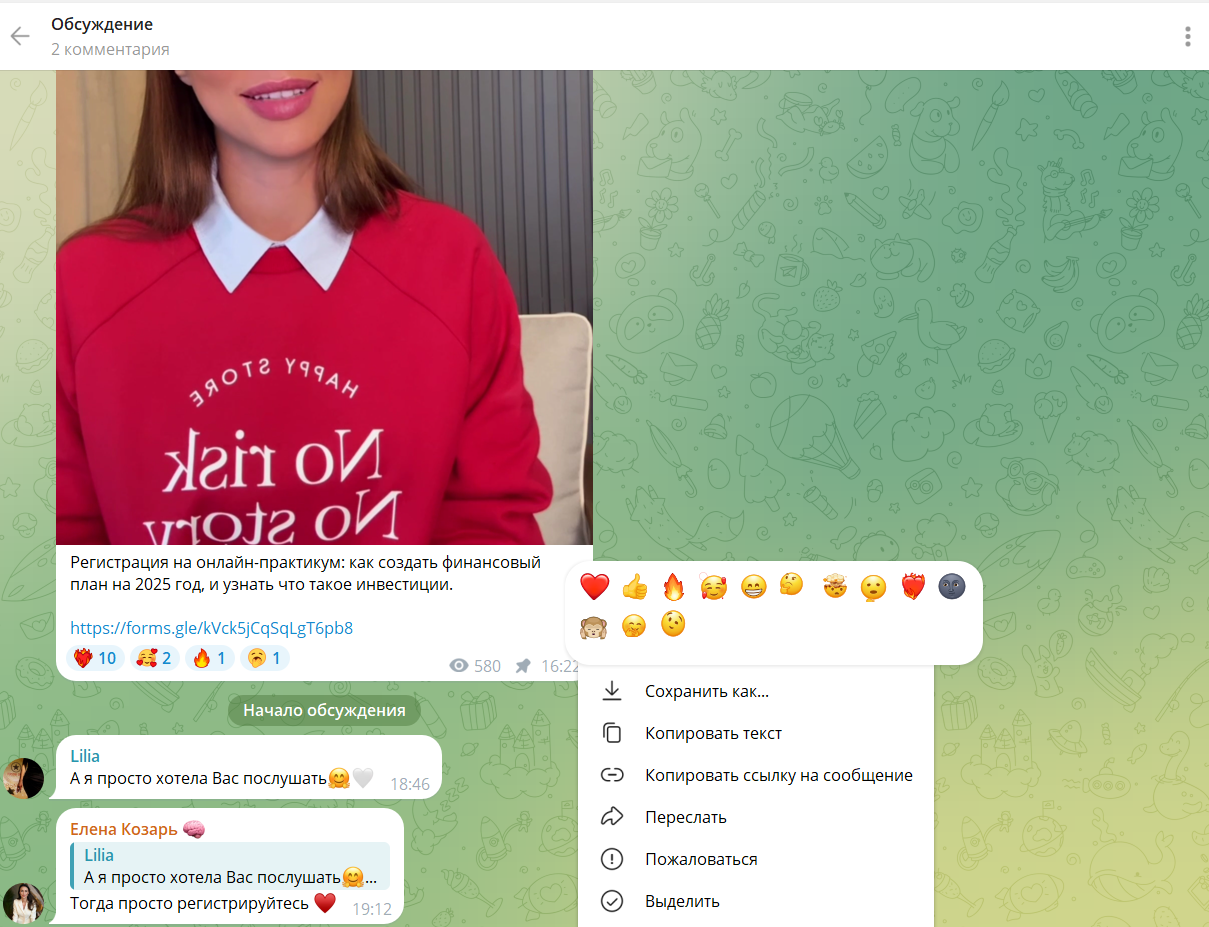 На канале предлагается обучение инвестициям. При этом Елена Козарь не размещает отзывы про свои инвестиции.Стоимость обучения неизвестна, для этого необходимо обращаться в личный аккаунт Елены Wsab777. Проводится оно в формате онлайн-конференции в Zoom. В комментариях к постам пользователи пишут общие фразы без важной информации. Реакции ограничены только положительными вариантами, что не позволяет оценить объективное отношение аудитории к информации автора.