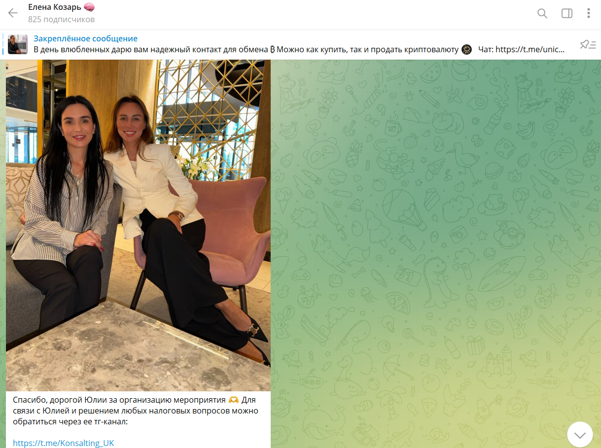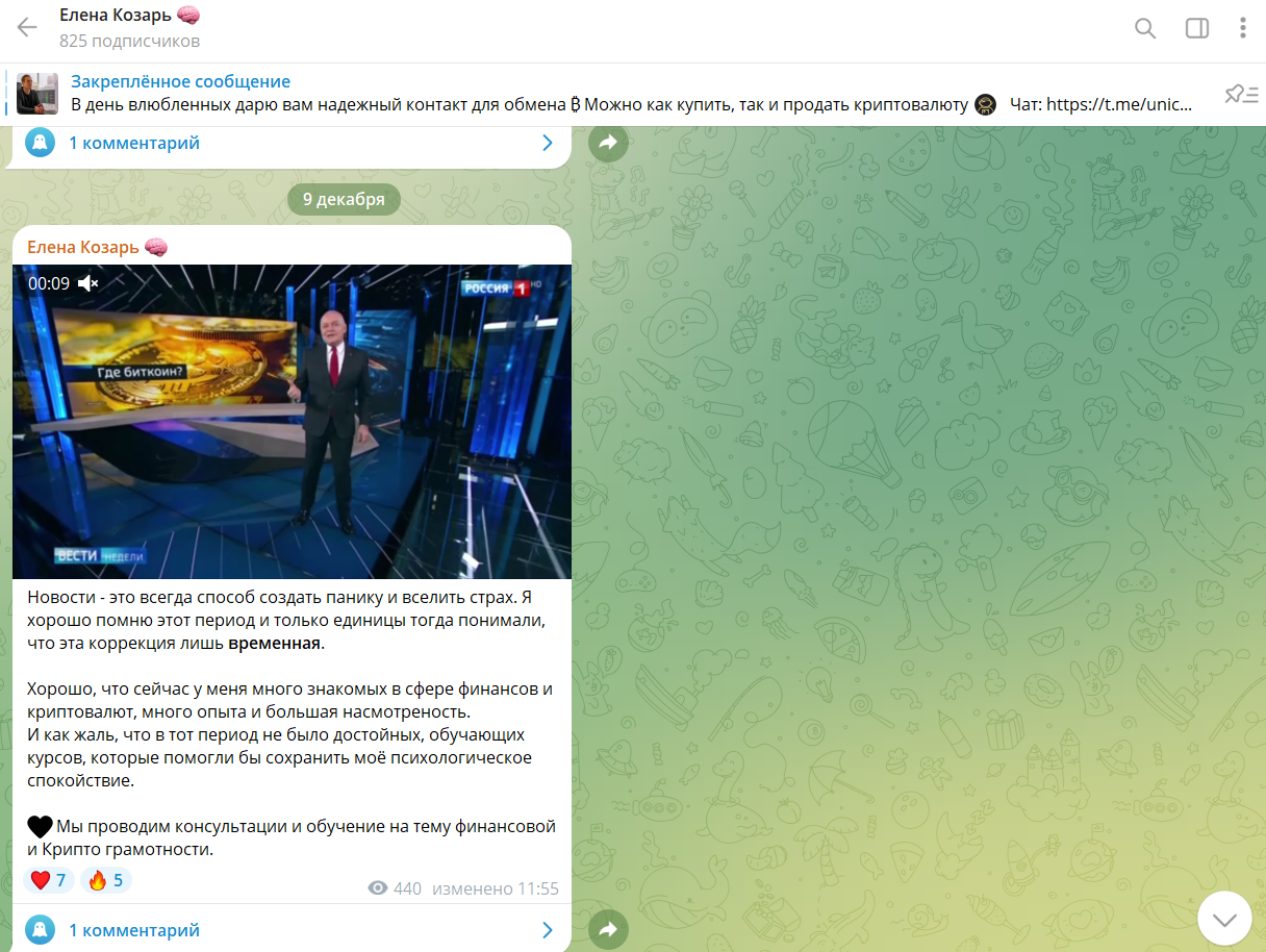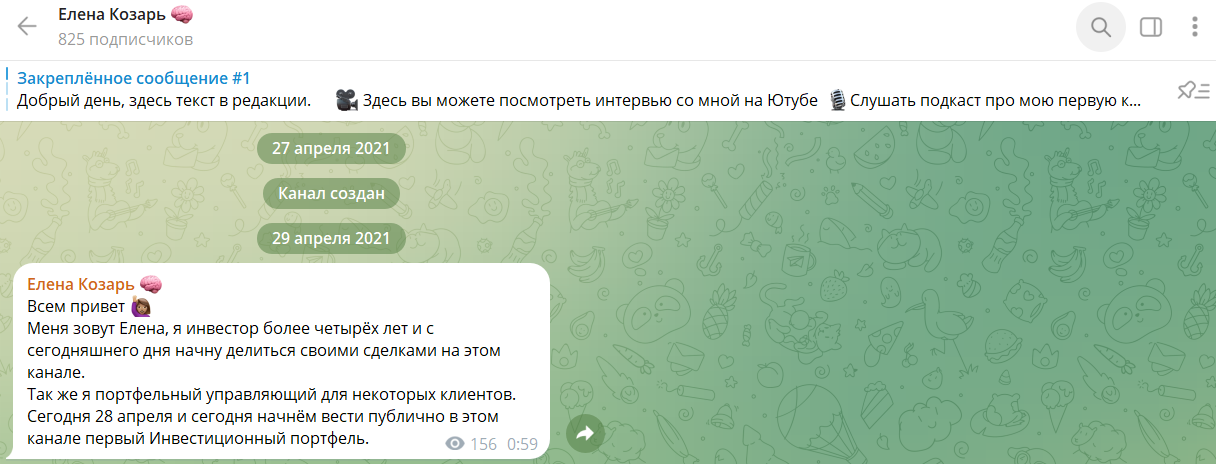 Общение с подписчиками Елена ведет на одноименном канале в Телеграмм, который был создан в апреле 2021 года. В приветственном сообщении она сообщает, что является инвестором с 4-х летним стажем. Инвестиции Елены Козарь стоит расценивать как любительские попытки заработать, так как она не имеет квалификации и профильного образования.