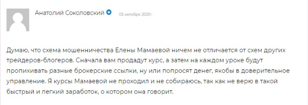 Положительных мнений о проекте MamaevaSchool Bot и самом трейдере очень мало. В интернете практически не найти честных отзывов на тему: «Полезны ли уроки Елены Мамаевой». Например, один из учеников, который проходил курсы, утверждает, что уроки были пройдены на одном дыхании. Ему понравились эти занятия, он выполнял все домашние задания.