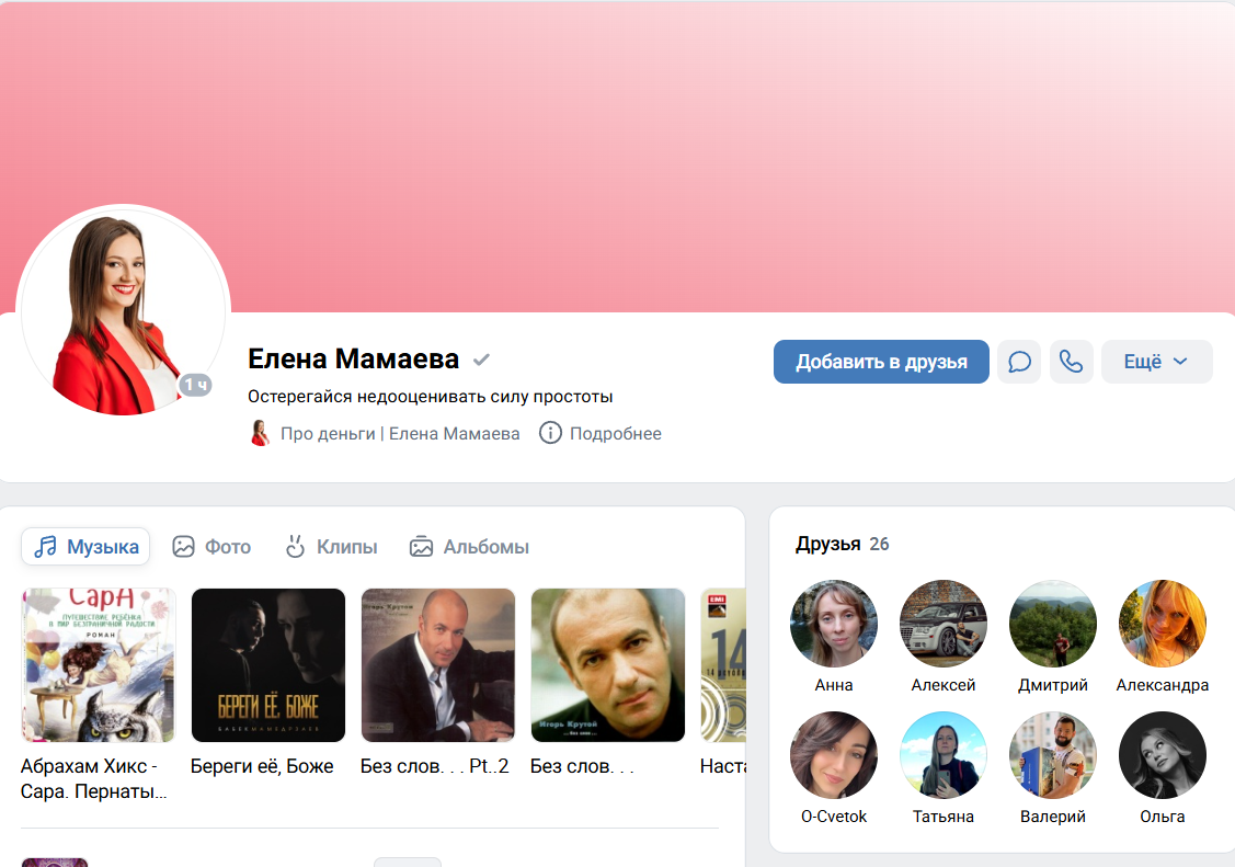 У автора проекта имеется профиль во ВКонтакте Mamaeva Pro Dengi, в котором она публикует различные посты, не связанные с инвестициями или трейдингом. На апрель 2025 года в ВК на нее подписано 26 друзей.